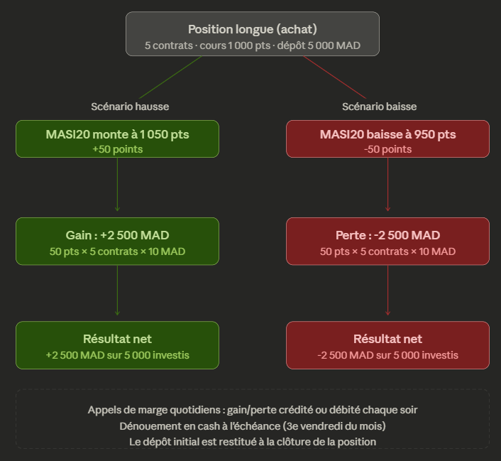 La première : l'effet de levier. Avec seulement 5 000 MAD de dépôt, l'investisseur contrôle une position notionnelle de 50 000 MAD (5 contrats × 1 000 pts × 10 MAD). Un mouvement de 5% sur l'indice génère un gain ou une perte de 2 500 MAD — soit 50% du capital mobilisé. C'est précisément ce qui rend cet instrument puissant, et exigeant.