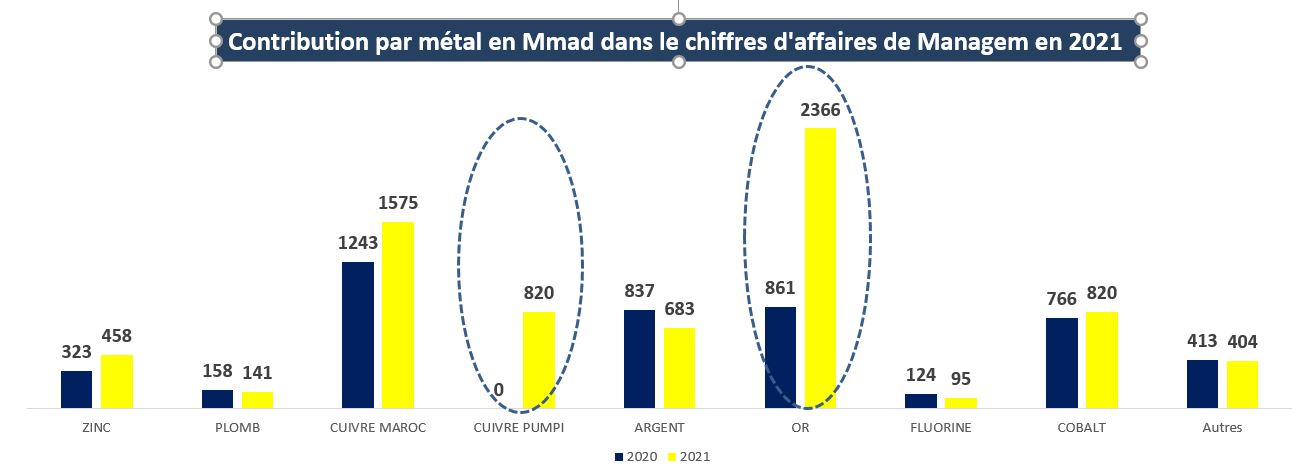 Le groupe Managem a profité en 2021 d’une année pleine de hausse des matières premières ( métaux précieux et industriels) , la montée en puissance de la production d’or notamment deTRI-K et de cuivre à pumpi ont pu compenser la baisse de la production et la teneur sur certaines mines notamment dans le cobalt, le plomb et surtout dans l’argent à travers SMI qui connaît une baisse structurelle de sa teneur depuis ces dernières années.