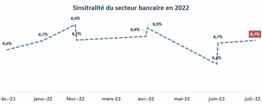 A noter par ailleurs que la sinistralité bancaire se dégrade légèrement à 8,7% . En effet les créances en souffrance ont bondi de 4,4%, soit un additionnel de 3,7 Milliards de MAD depuis le début d’année contre une hausse de 6,7% en 2021