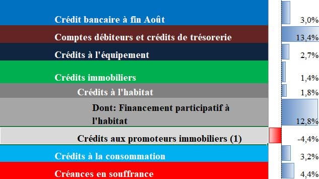 Depuis le début d’année, les crédits bancaires affichent une hausse de 3% tirés principalement par les encours de trésorerie (+13,4%) dans un contexte de rallongement des délais de paiement ,et de hausse de matières premières ( céréales , gaz, hydrocarbures…), augmentant le besoin en trésorerie des importateurs pour financier leurs opérations. Cette tendance s’est accentuée depuis le déclenchement de la crise sanitaire ou ce segment a réalisé une croissance deux fois supérieur au marché, alimenté par les programmes de soutien étatiques (Damane Oxygène et relance). Les comptes débiteurs et crédits de trésorerie représentent à fin Août 2022 : 25% des encours globaux contre seulement 21% avant le déclenchement de la crise sanitaire