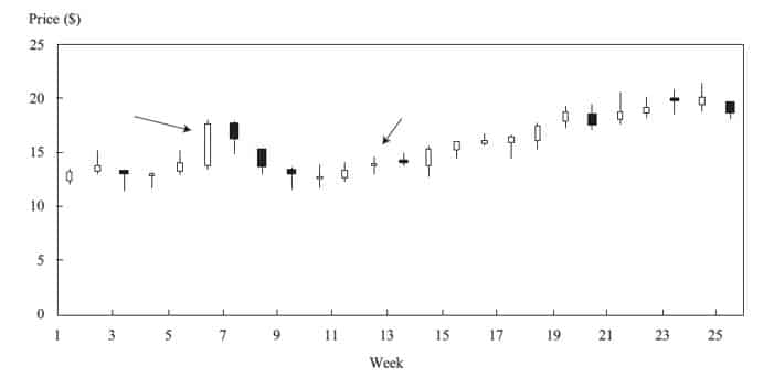 En revanche, la douzième bougie montre que le titre a ouvert et fermé au même prix, ce qui crée une configuration en croix. Dans la terminologie japonaise utilisée dans les Candlestick Chart, cette configuration est appelée « doji ».